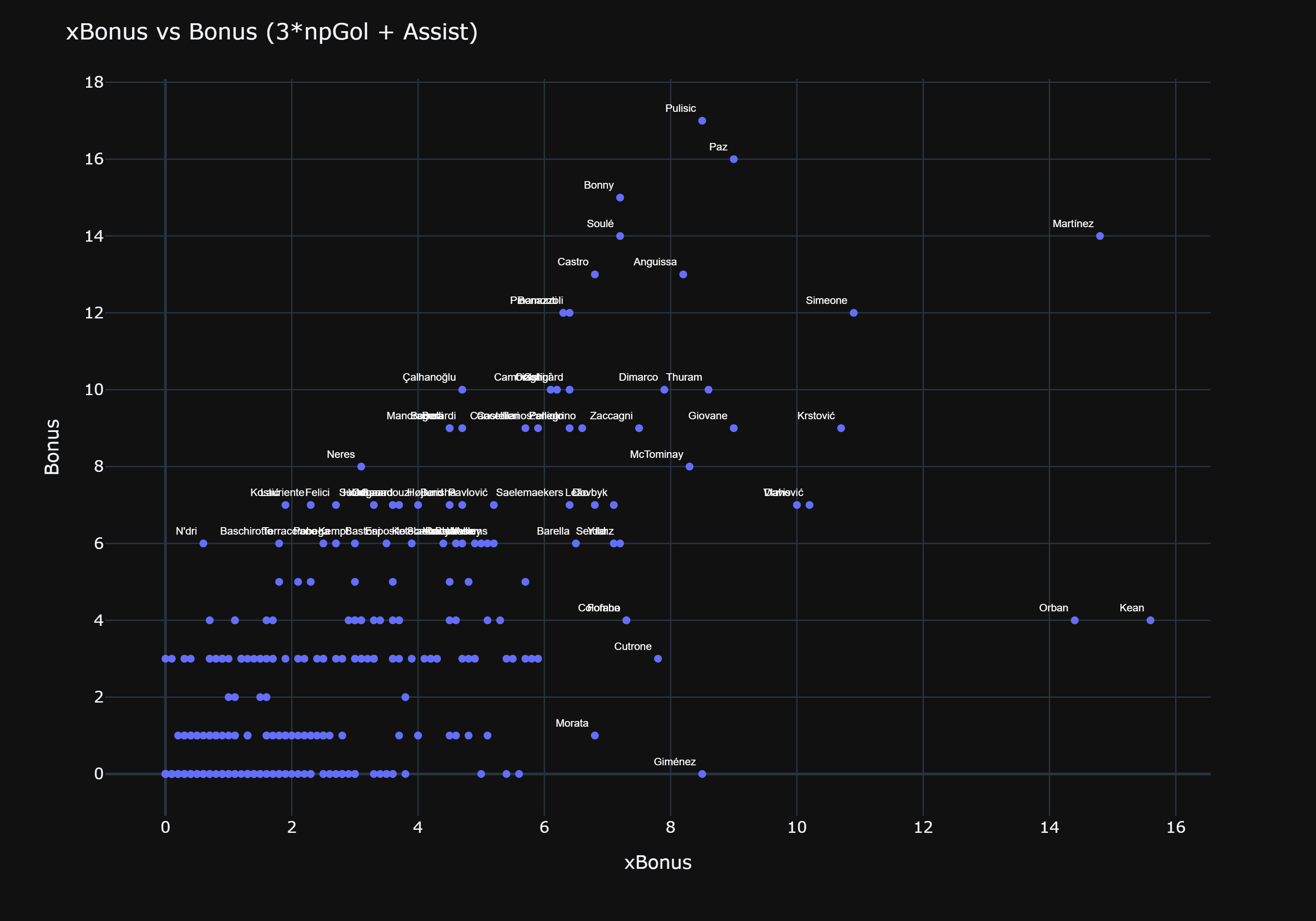 E’ vero, hanno dalla loro anche i rigori (anche se per l’americano ad ora non hanno aiutato), ma il secondo grafico non considera i rigori e li vede comunque in testa per bonus collezionati. La punta che spicca di più in quel settore è Bonny, ma non è un titolare all’Inter.
